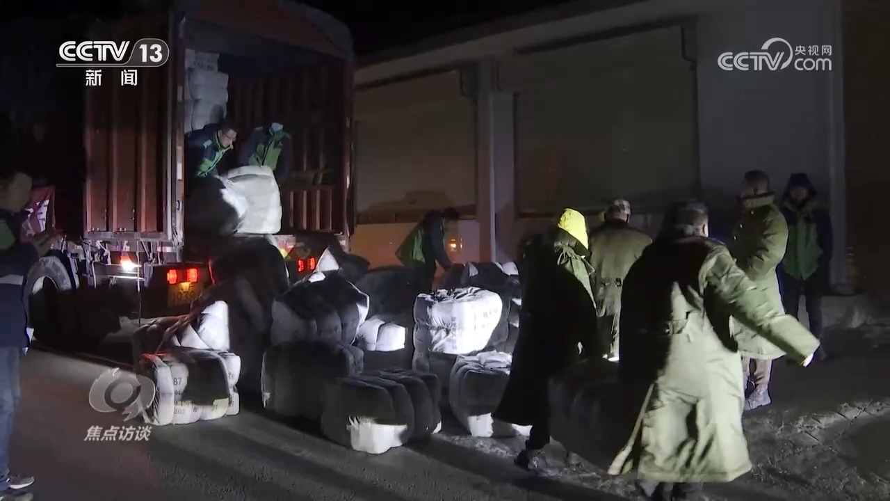 為了盡快給村民送去保障物資,刁四村村民的車隊(duì)日夜兼程。22日凌晨,歷經(jīng)32個(gè)小時(shí),帶著全村2000多人的囑托,這個(gè)車隊(duì)跨越1600公里,終于抵達(dá)了積石山縣的安集鎮(zhèn)。顧不上休息,刁四村的村民就和當(dāng)?shù)卮迕褚黄鸢沿浳镄读讼聛?。五車物資,足足卸了三個(gè)小時(shí),其中包括2400件軍大衣、2580件棉被、1820副自發(fā)熱鞋墊。