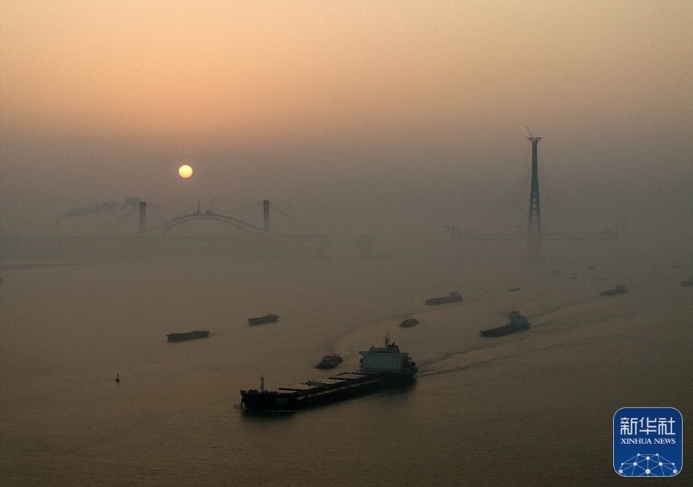 1月1日,船只在晨光中經(jīng)過(guò)位于江蘇省泰興市的常泰長(zhǎng)江大橋建設(shè)現(xiàn)場(chǎng)(1月1日攝,無(wú)人機(jī)照片)。新華社發(fā)(湯德宏 攝)