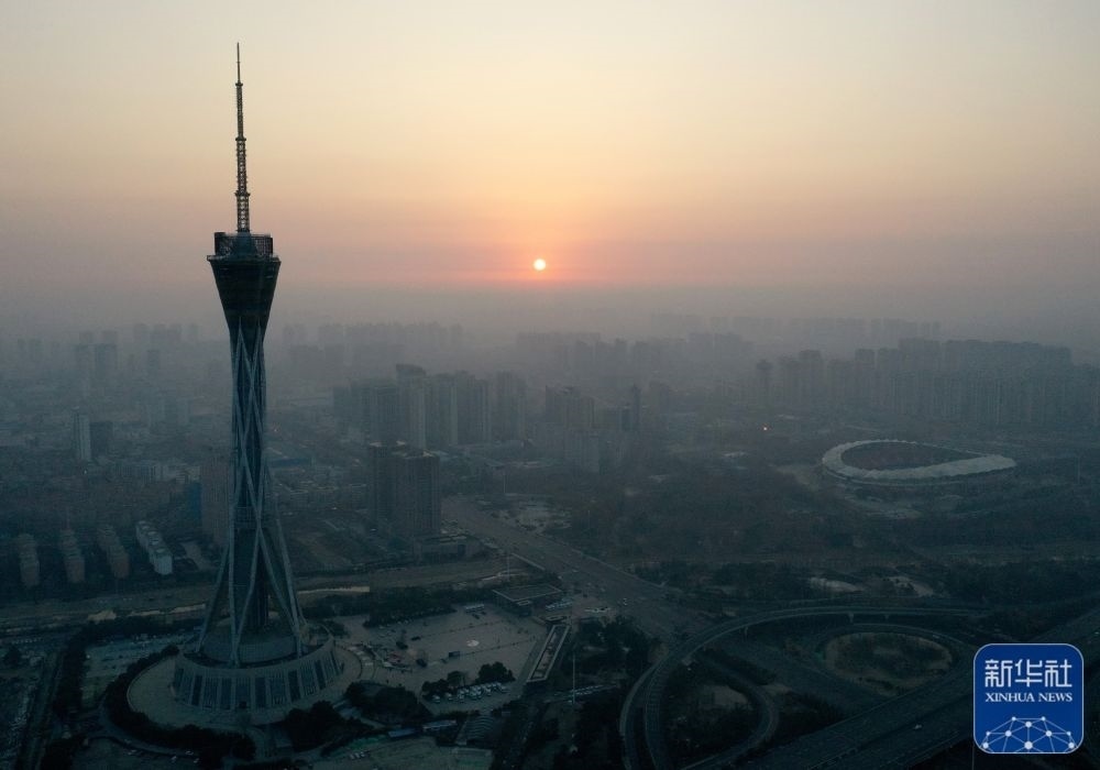 這是1月1日在河南省鄭州市中原福塔附近拍攝的日出(無(wú)人機(jī)照片)。新華社記者 李嘉南 攝