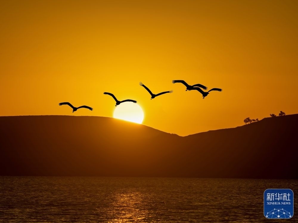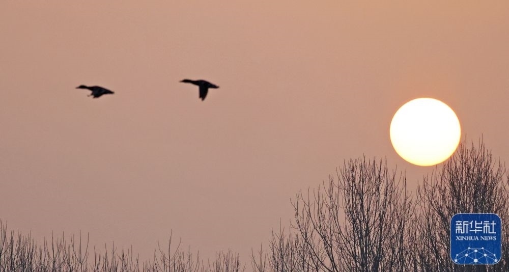 1月1日,在山東省臨沂市郯城縣,鳥(niǎo)兒迎著晨光飛翔。新華社發(fā)(張春雷 攝)