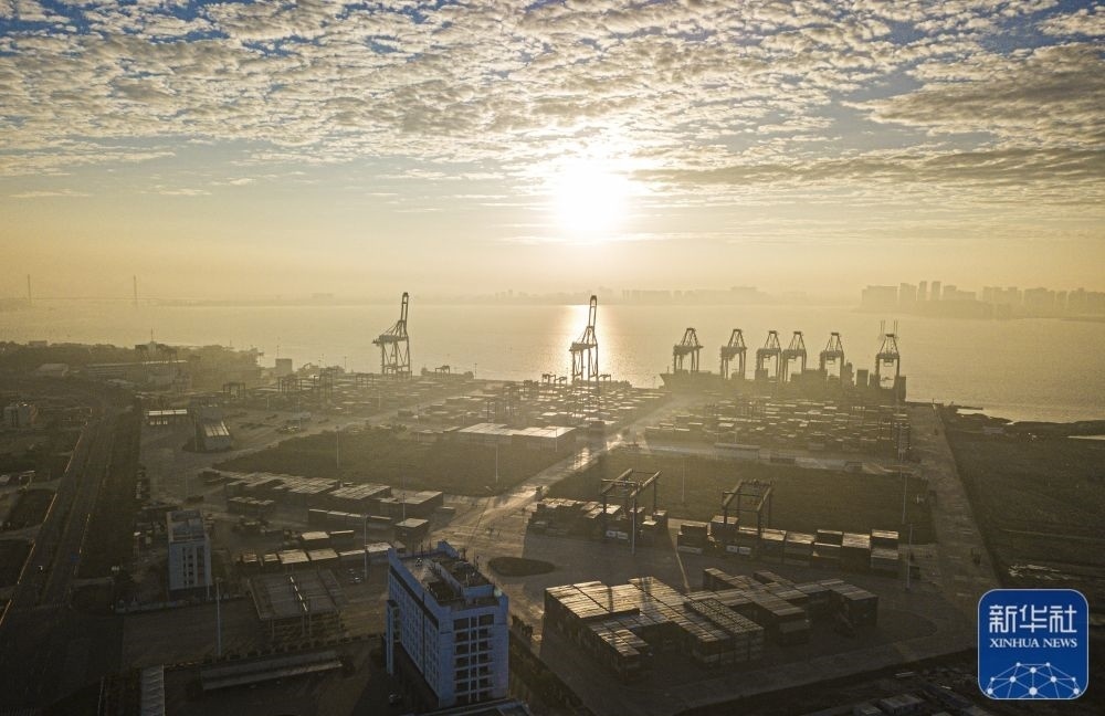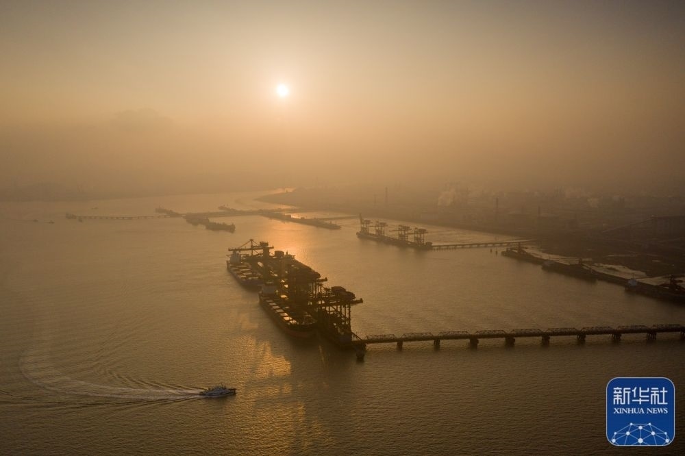 1月1日,在新年第一縷晨光里,浙江省寧波舟山港北侖港區(qū)礦石碼頭生產(chǎn)一派繁忙(無(wú)人機(jī)照片)。新華社發(fā)(蔣曉東 攝)