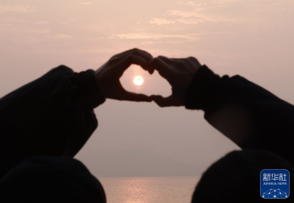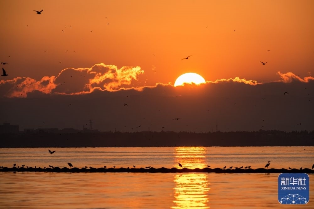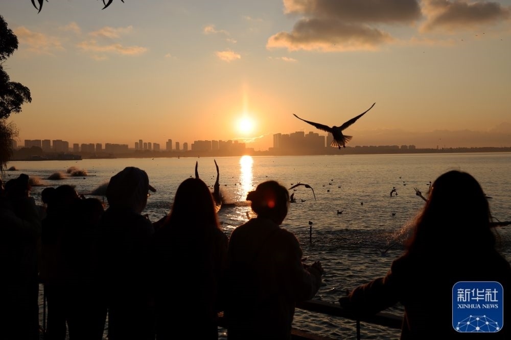1月1日,在云南省昆明市西山區(qū)滇池,人們?cè)谟^賞新年第一天的日出。新華社發(fā)(張正舉 攝)