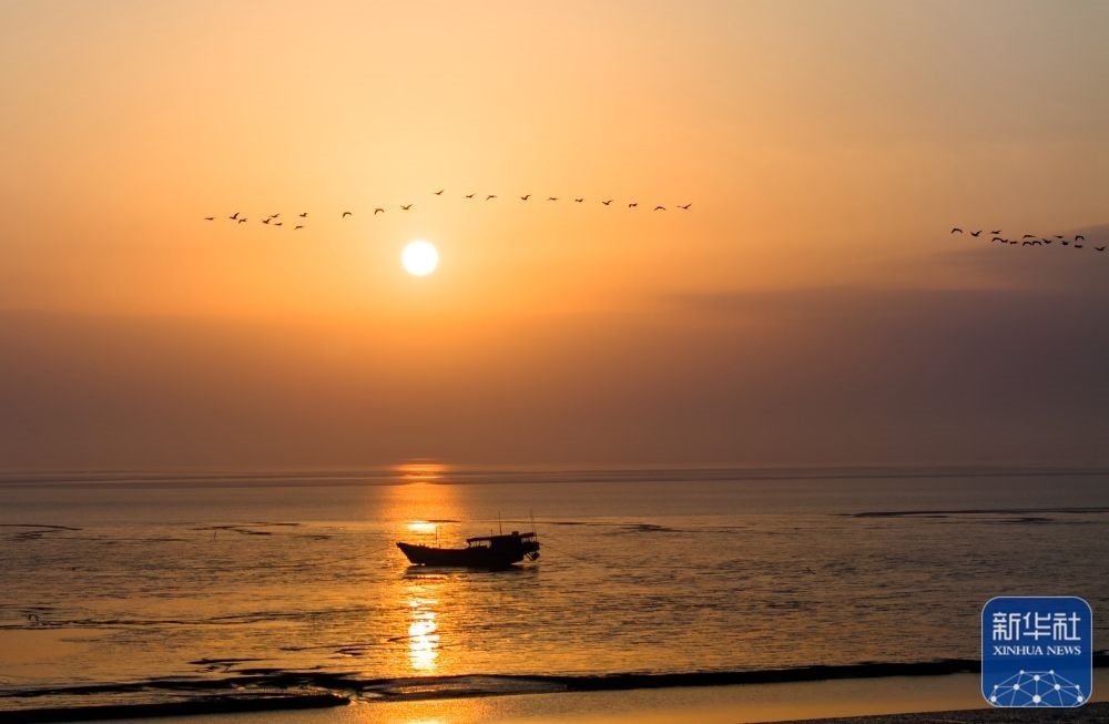 1月1日,在位于江蘇鹽城的中國(guó)黃(渤)海候鳥(niǎo)棲息地(第一期)核心區(qū)域東臺(tái)條子泥海濱,鳥(niǎo)兒迎著朝霞飛翔(1月1日攝,無(wú)人機(jī)照片)。新華社發(fā) (孫家錄 攝)