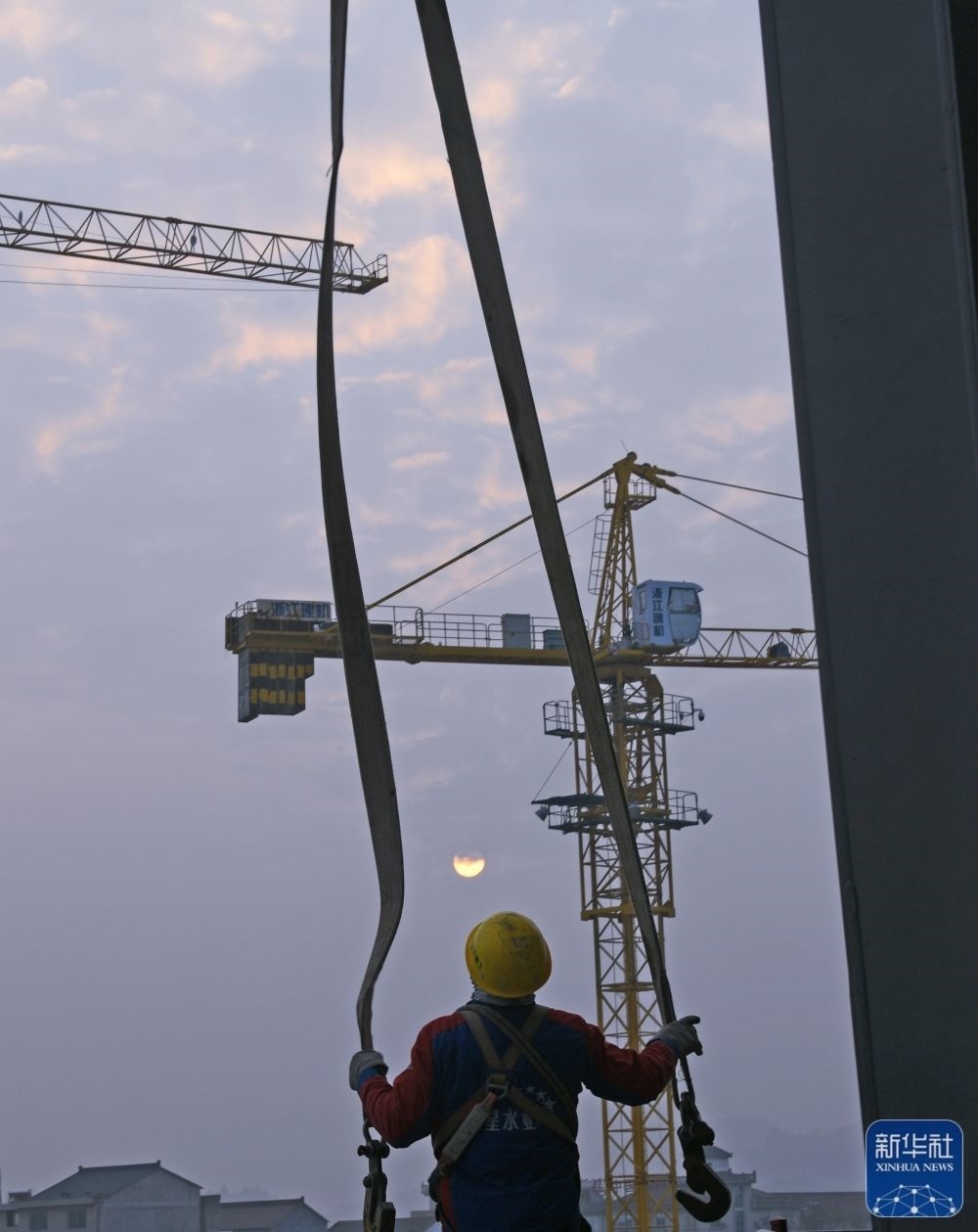 1月1日,工人迎著朝陽(yáng)在浙江省杭溫高鐵臺(tái)州市仙居站項(xiàng)目施工現(xiàn)場(chǎng)進(jìn)行施工作業(yè)。新華社發(fā)(王華斌 攝)