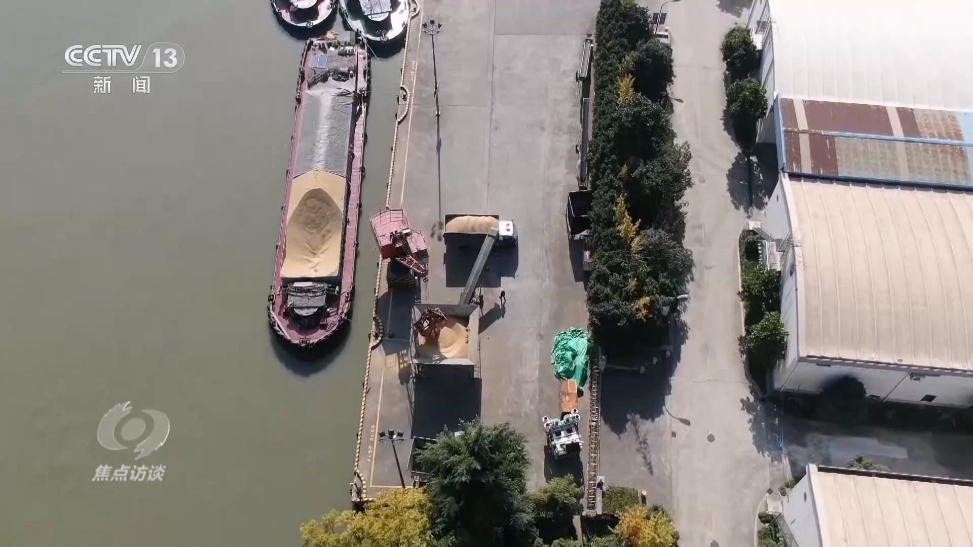 在京杭大運(yùn)河浙江余杭段的這個(gè)碼頭上,貨船上的稻谷正在被轉(zhuǎn)送到貨車上。碼頭旁是浙江省糧食局直屬糧油儲(chǔ)備庫,稻谷將被儲(chǔ)存在這些倉庫里。