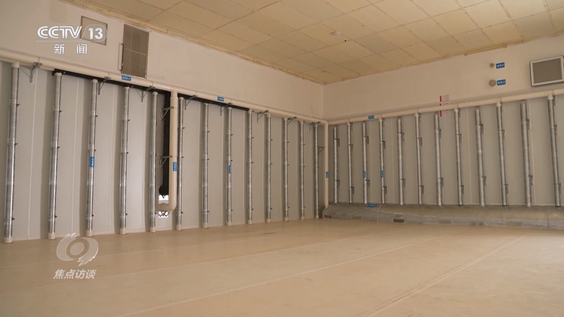 當(dāng)工作人員打開這座暫時(shí)空著的倉庫時(shí),墻壁上的一排排管道十分搶眼,天氣熱的時(shí)候,這四面墻的氣道里都會(huì)充入冷空氣,再加上頂部的風(fēng)道,這“五面立體動(dòng)態(tài)控溫技術(shù)”就相當(dāng)于給糧倉內(nèi)外加了一道隔離帶,低溫保鮮。