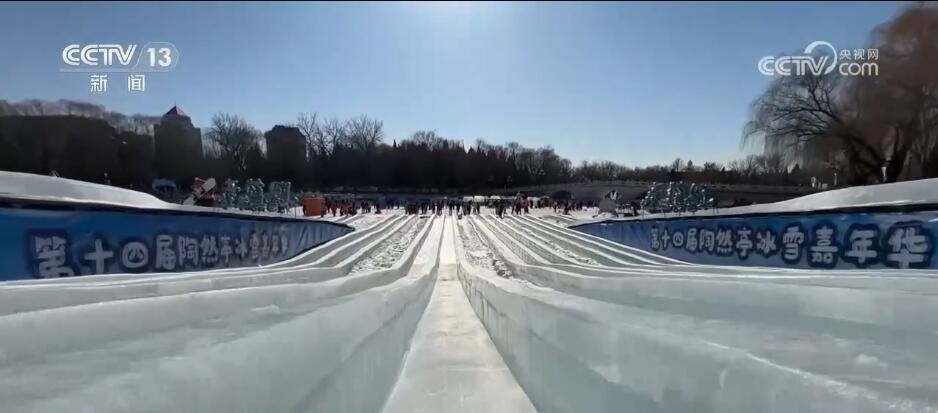 總臺記者 袁嘉憶:這里是陶然亭公園冰雪嘉年華的現(xiàn)場,我手邊的這個設施就是北京核心區(qū)規(guī)模最大的冰滑梯。我們可以看到這個冰滑梯有10條滑道,每一條滑道都有120多米長,而且上下具有5米高的落差。體驗起來會是什么樣?來,跟我走。