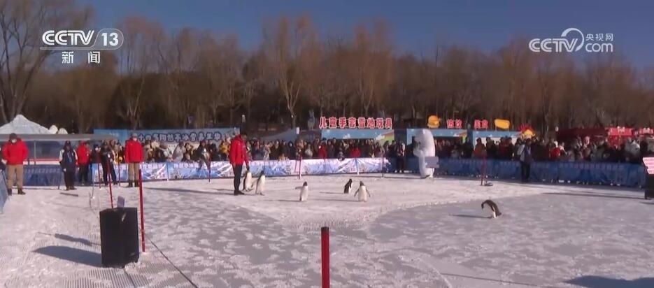 總臺記者 袁嘉憶:這邊圍攏了這么多人在看什么呢?這就是歷年陶然亭公園冰雪嘉年華的頂流——企鵝。這是今年公園首次讓小企鵝們走出了飼養(yǎng)間,與游客們近距離地進行互動。瞧,大家正把鏡頭對準這些憨態(tài)可掬的小家伙們呢。