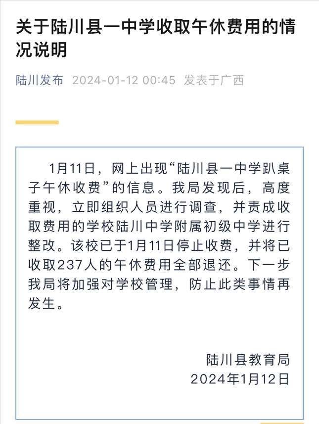 ·廣西陸川一中學收取“趴桌費”?當?shù)亟逃郑贺煶蓪W校整改,已退還全部費用。