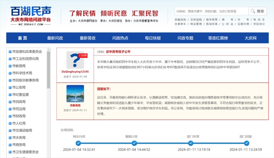 ·家長稱大量河南中學生“中考移民”至黑龍江大慶各個中學,官方回應:暫時關閉學籍系統(tǒng),成立聯(lián)合調查組徹查違規(guī)行為。
