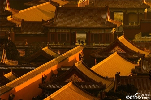 北京冬日傍晚,故宮建筑在夕陽中呈現(xiàn)迷人光影。