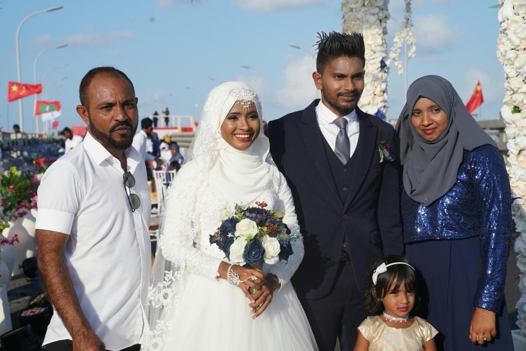 2018年8月31日,在剛剛正式通車的中馬友誼大橋上,一對馬爾代夫新婚夫婦與家人合影。