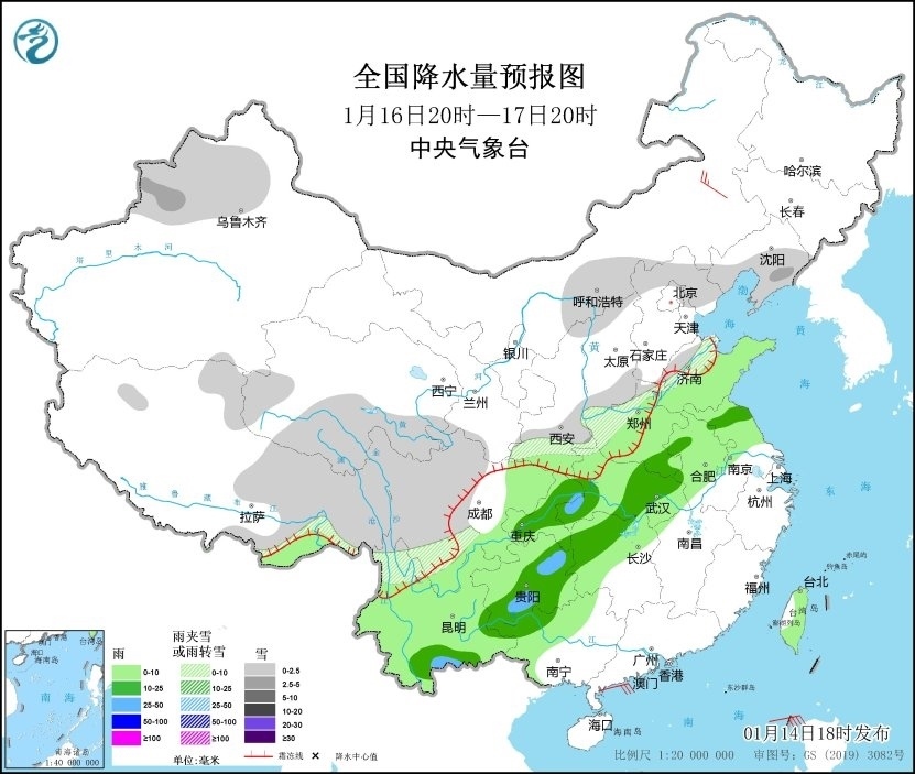 圖1 全國降水量預(yù)報(bào)圖(1月14日20時(shí)-15日20時(shí))