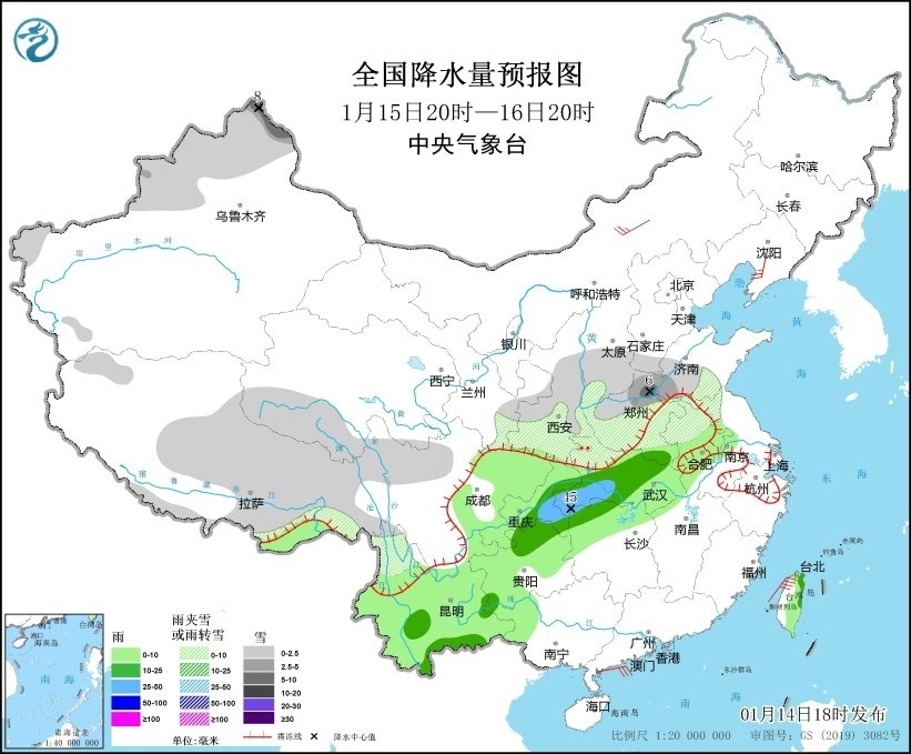 1月14日20時(shí)至15日20時(shí),新疆北疆西北部、西藏東部、甘肅東部、陜西、山西南部、河南等地的部分地區(qū)有小到中雪,其中新疆阿勒泰、陜西南部、河南西部等地的部分地區(qū)有大雪,局地暴雪(10~12毫米),陜西南部、湖北西北部局地有凍雨;西南地區(qū)東部、江漢中西部、江南西部和東北部、廣西西部和北部、云南南部、海南島等地有小到中雨,其中重慶中北部等地局地有大雨(25~35毫米)。山東半島、江南東北部、西藏等地的部分地區(qū)有4~6級(jí)風(fēng),其中浙江東部沿海、西藏中部的部分地區(qū)風(fēng)力可達(dá)7級(jí)以上(見圖1);臺(tái)灣海峽有7~8級(jí)、陣風(fēng)9級(jí)的東北風(fēng),黃海、東海大部、南海中北部和西南部有5~7級(jí)風(fēng),陣風(fēng)8級(jí)。