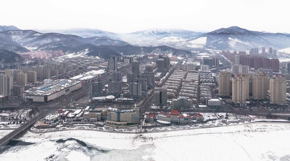 吉林省通化市城區(qū)和遠(yuǎn)處的萬峰通化滑雪度假區(qū)(無人機(jī)照片)。新華社記者 許暢 攝