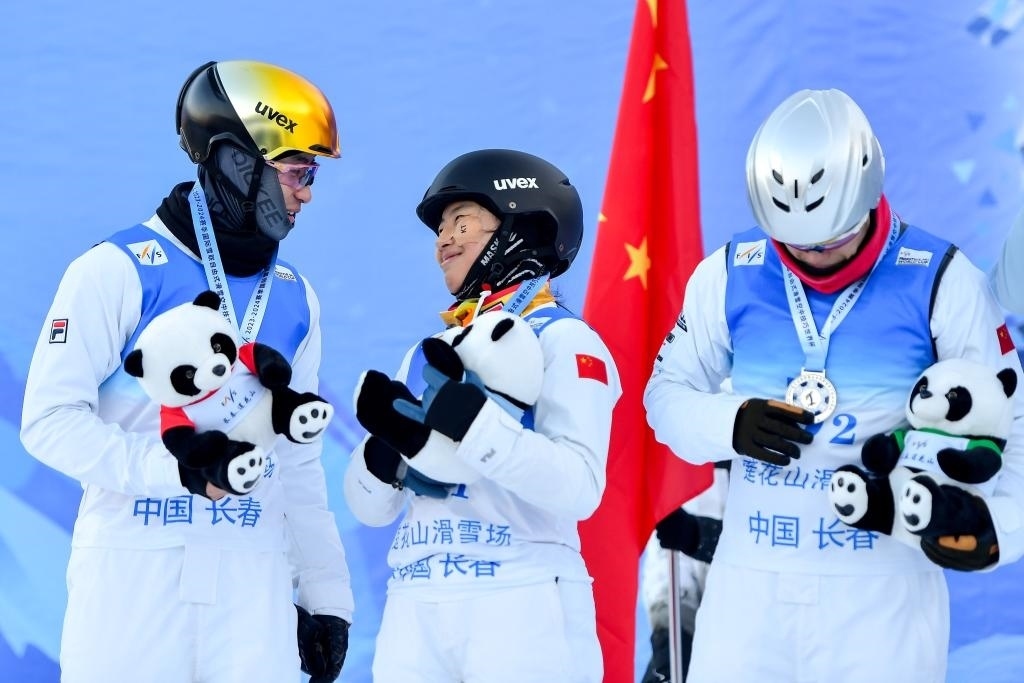12月17日,獲得亞軍的中國二隊(duì)選手陳梅婷(中)、王心迪(右)和李天馬在頒獎儀式上。當(dāng)日,2023-2024賽季國際雪聯(lián)自由式滑雪空中技巧世界杯(中國長春分站賽)男女混合團(tuán)體決賽在吉林長春蓮花山滑雪場舉行。新華社記者 許暢 攝