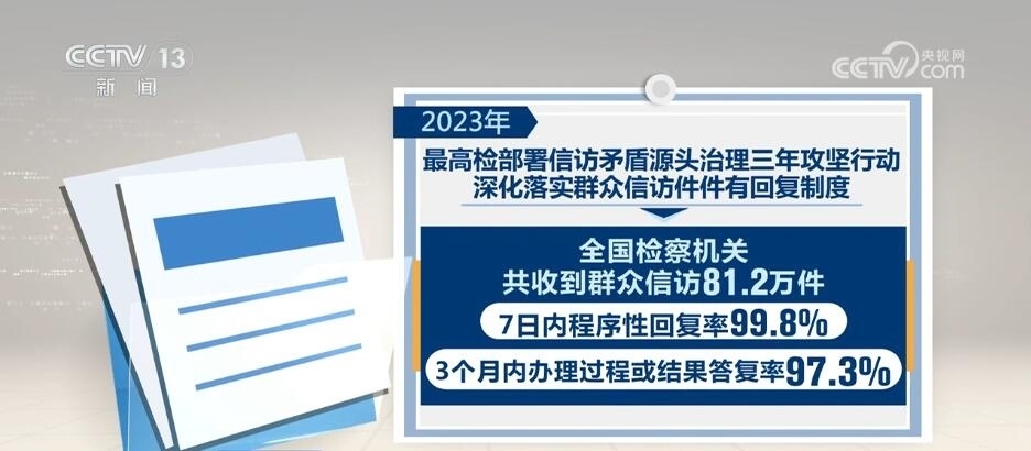 2023年,最高檢部署信訪矛盾源頭治理三年攻堅行動,深化落實群眾信訪件件有回復(fù)制度。全國檢察機(jī)關(guān)共收到群眾信訪81.2萬件,7日內(nèi)程序性回復(fù)率99.8%,3個月內(nèi)辦理過程或結(jié)果答復(fù)率97.3%。