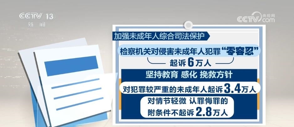 加強未成年人綜合司法保護(hù)。檢察機(jī)關(guān)對侵害未成年人犯罪“零容忍”,起訴6萬人。堅持教育、感化、挽救方針,對犯罪較嚴(yán)重的未成年人起訴3.4萬人;對情節(jié)輕微、認(rèn)罪悔罪的,附條件不起訴2.8萬人。部署加強犯罪預(yù)防工作,推動罪錯未成年人分級干預(yù),協(xié)調(diào)推動專門學(xué)校建設(shè),依法矯治有嚴(yán)重不良行為的未成年人。