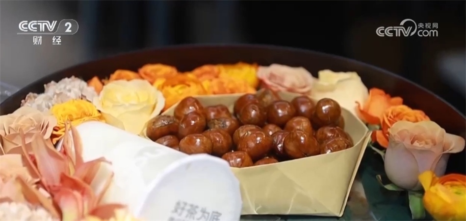 一些商家也是緊跟潮流,順勢推出“入冬四件套”禮盒。這家花店把鮮花、奶茶、糖葫蘆、糖炒栗子組合起來售賣,受到許多消費(fèi)者的歡迎。?