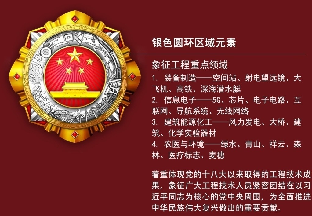 獎章中的工程技術(shù)元素選取的是我國具有代表性的工程技術(shù)成果,如高速鐵路、5G、港珠澳大橋、雜交水稻等,象征我國科技創(chuàng)新事業(yè)發(fā)生的歷史性、整體性、格局性重大變化。
