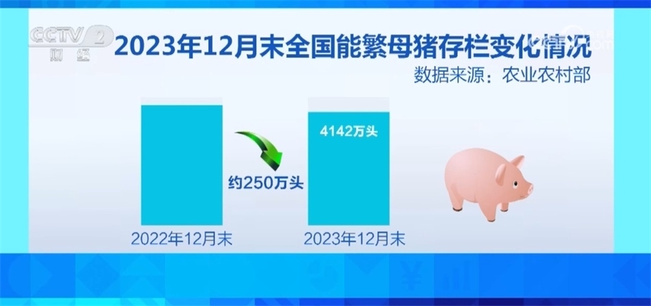 針對生豬產(chǎn)能偏高、養(yǎng)殖持續(xù)虧損的問題,農(nóng)業(yè)農(nóng)村部指導各地加強生豬產(chǎn)能調(diào)控,引導養(yǎng)殖場戶適應(yīng)性調(diào)減產(chǎn)能,順時順勢出欄肥豬,加快供需回歸均衡。2023年12月末,全國能繁母豬存欄量4142萬頭,比2022年12月末的階段性高點減少約250萬頭。