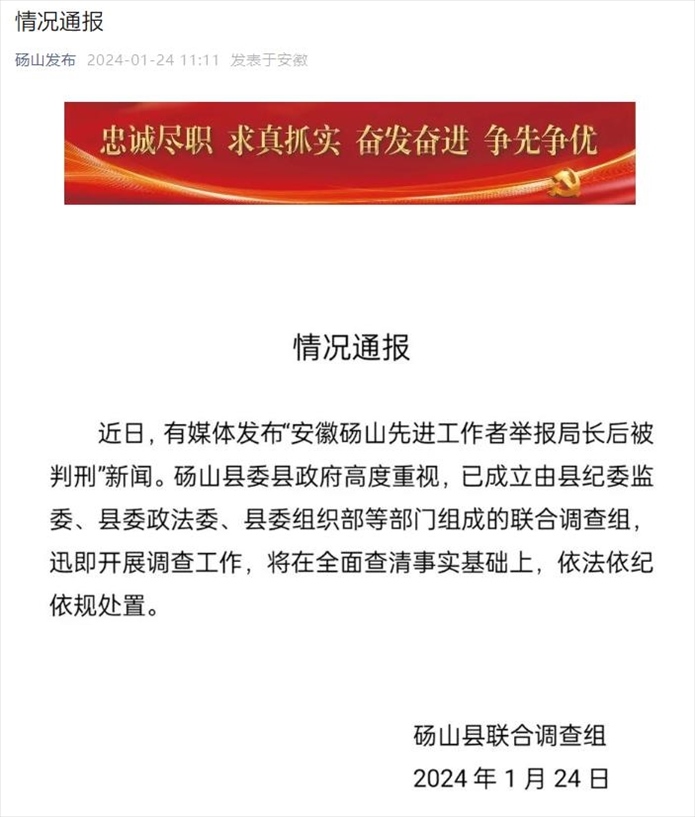 ·安徽碭山先進(jìn)工作者舉報(bào)局長后被判刑?碭山縣回應(yīng):已成立聯(lián)合調(diào)查組迅即開展調(diào)查工作,將在全面查清事實(shí)基礎(chǔ)上,依法依紀(jì)依規(guī)處置。