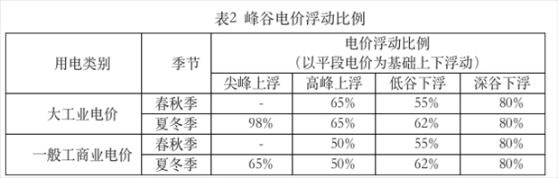 ?。ㄈ┱{(diào)整峰谷電價(jià)浮動比例,具體見表2。浮動比例以平段電價(jià)為基礎(chǔ),平段電價(jià)包含上網(wǎng)電價(jià)、上網(wǎng)環(huán)節(jié)線損費(fèi)用、系統(tǒng)運(yùn)行費(fèi)用、輸配電價(jià)(不含容(需)電價(jià))、政府性基金及附加。