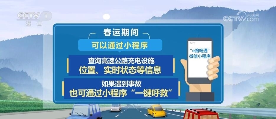 為提升今年春運(yùn)服務(wù),交通運(yùn)輸部還上線“e路暢通”微信小程序,春運(yùn)期間,大家可以通過(guò)小程序,查詢高速公路充電設(shè)施位置、實(shí)時(shí)狀態(tài)等信息,如果遇到事故,也可通過(guò)小程序“一鍵呼救”。