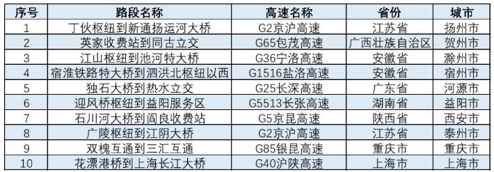 春節(jié)期間,全國高速公路預(yù)計(jì)易發(fā)生擁堵緩行的路段,如下表所示。