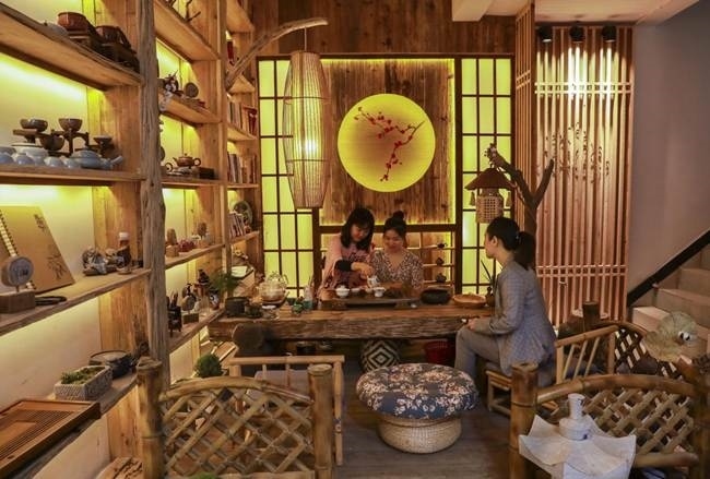 游客在獵神村商業(yè)街內茶室品茶。熊偉攝