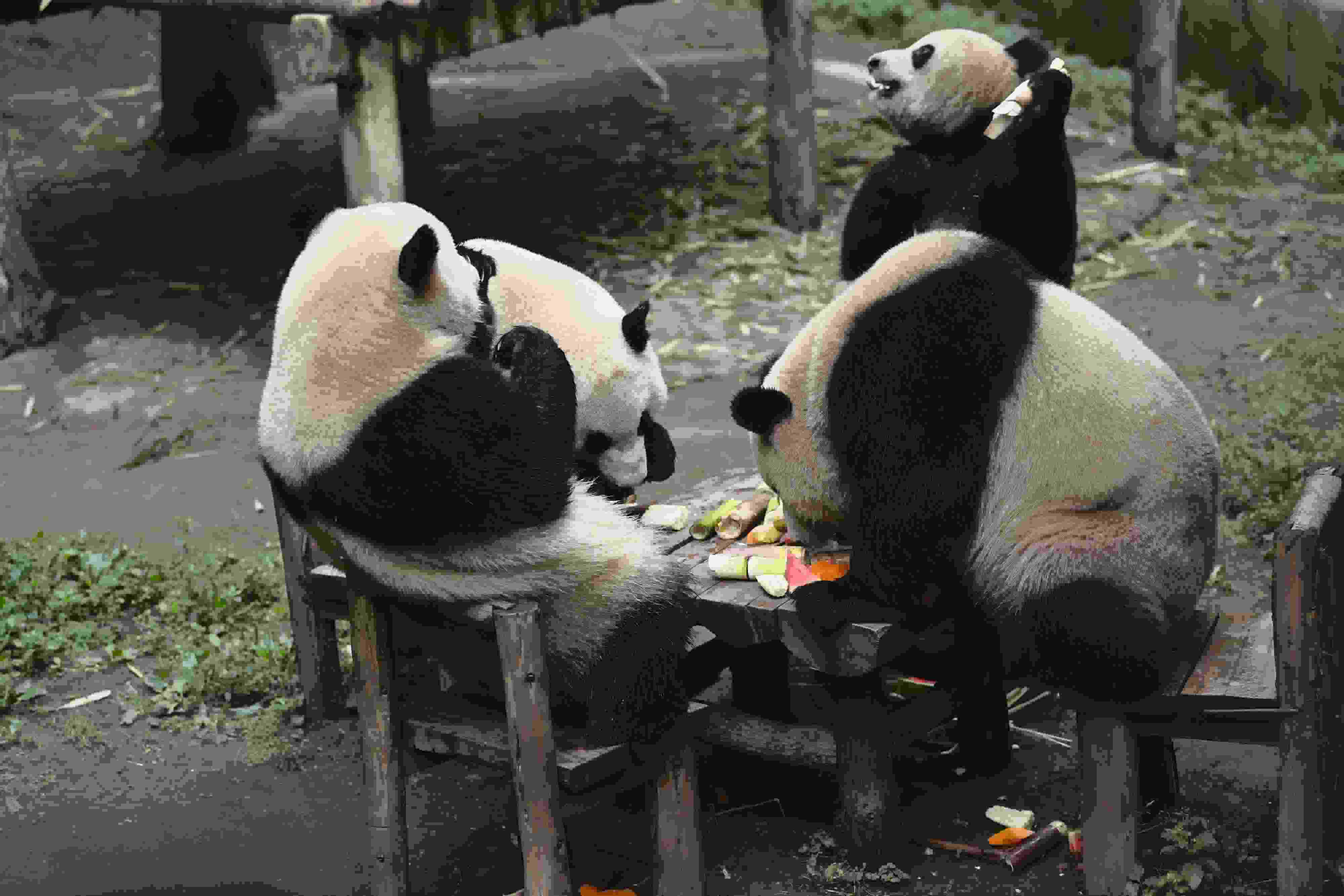 重慶:大熊貓圍桌共享大餐 5月21日,在重慶動(dòng)物園內(nèi),大熊貓圍桌而坐,享用美食,......