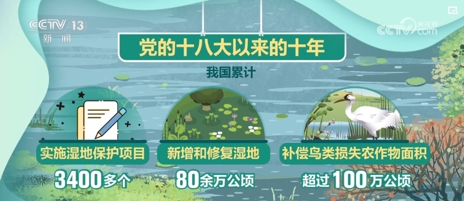 黨的十八大以來的十年,我國累計實(shí)施濕地保護(hù)項(xiàng)目3400多個,新增和修復(fù)濕地80余萬公頃,補(bǔ)償鳥類損失農(nóng)作物面積超過100萬公頃。
