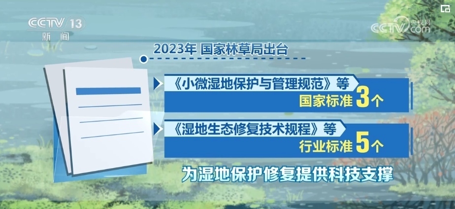 2023年,國家林草局出臺《小微濕地保護(hù)與管理規(guī)范》等國家標(biāo)準(zhǔn)3個、《濕地生態(tài)修復(fù)技術(shù)規(guī)程》等行業(yè)標(biāo)準(zhǔn)5個,為濕地保護(hù)修復(fù)提供科技支撐。