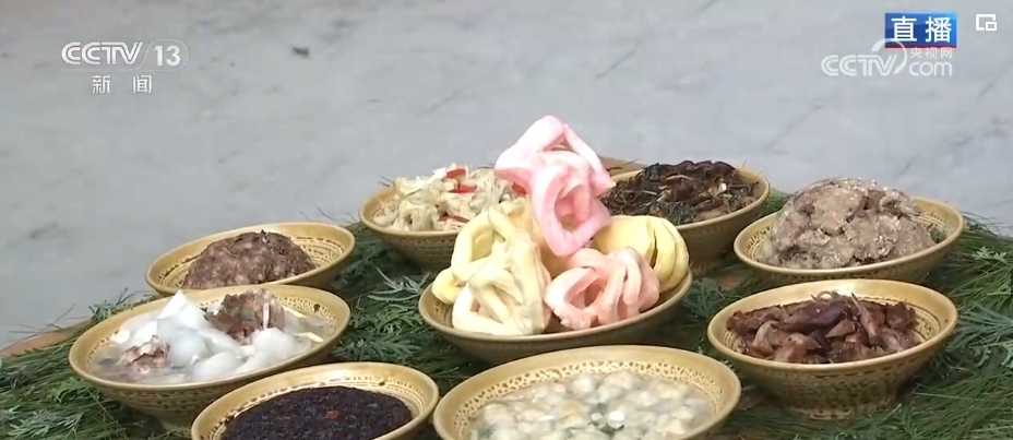 傳統(tǒng)“八大碗”,葷素搭配、香味撲鼻。這個(gè)菜叫做麻脆,是村民們過年的時(shí)候一定要吃上的美味。麻脆由糯米制作而成,不僅有不同的顏色,還可以制作成花鳥魚蟲、蔬菜水果等多種圖案。龍年到來(lái),村里還特別用蔬果做了一條中國(guó)龍。