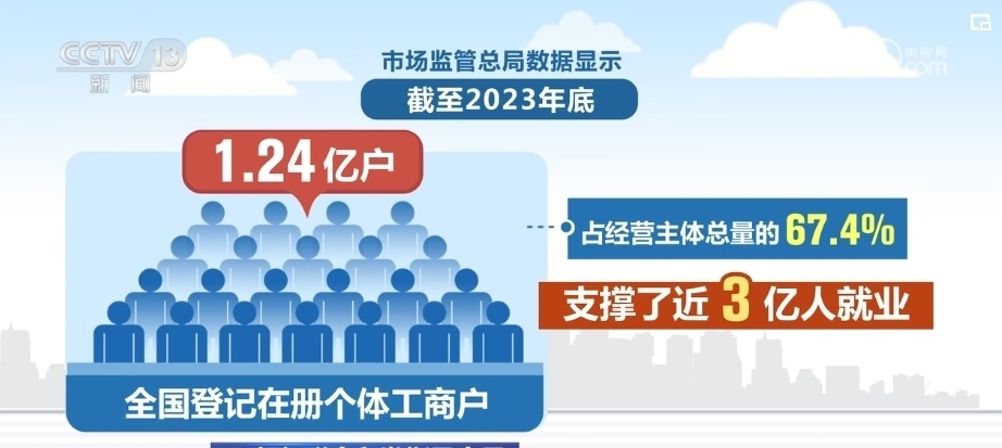 市場監(jiān)管總局數(shù)據(jù)顯示,截至2023年底,全國登記在冊個體工商戶1.24億戶,占經(jīng)營主體總量的67.4%,支撐了近3億人就業(yè)。