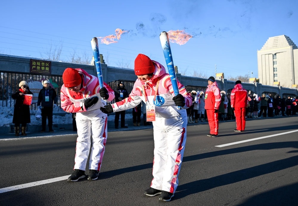 ??2月3日,在內(nèi)蒙古呼倫貝爾市滿洲里國(guó)門(mén)景區(qū),火炬手包玲玲(右)和錢(qián)卓在火炬?zhèn)鬟f活動(dòng)中。新華社記者 連振 攝