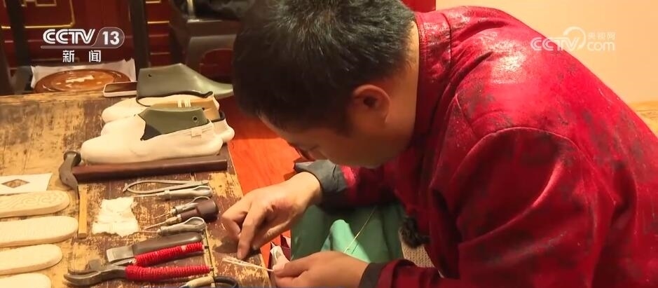 內(nèi)聯(lián)升千層底布鞋制作技藝第五代傳承人 徐文浩:手工納的底用的是一種麻繩,像機(jī)器納底用的就是棉線(xiàn)。這個(gè)麻繩我們也是手工搓出來(lái)的,機(jī)器走不了這種不規(guī)矩的線(xiàn)。這個(gè)麻繩在鞋底里整個(gè)會(huì)膨脹,會(huì)把所有的布鎖在一起,咱們穿的時(shí)候,說(shuō)第一層鞋底磨破了,麻繩都磨斷了,它不會(huì)散,它只會(huì)越磨越薄。像這種機(jī)器納的,這個(gè)線(xiàn)如果說(shuō)磨斷了,這個(gè)底一層一層就開(kāi)始脫落了。