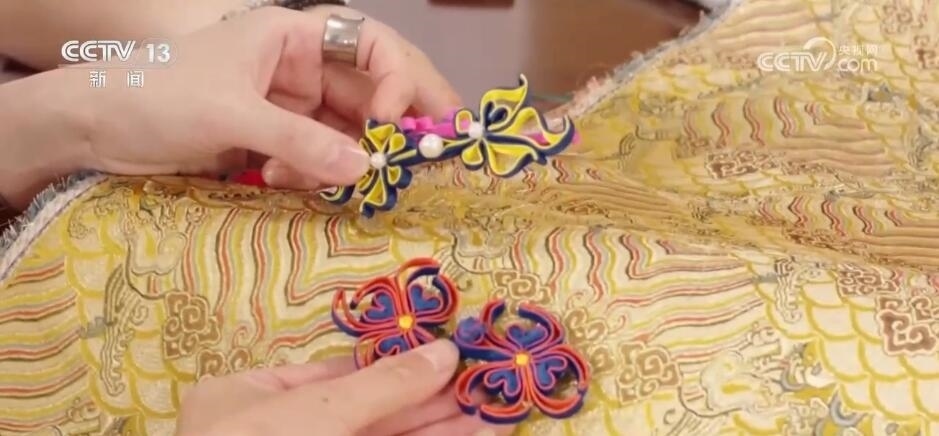 瑞蚨祥中式服裝手工制作技藝傳承人 汪超:這個(gè)就是機(jī)器(制作)的,你會(huì)看到它比較硬,比較板式一點(diǎn)。您看咱們手工的感覺(jué)就很軟,而且每一朵花像有生命力一樣。最不一樣看背面,它要不停地?fù)Q線(xiàn),不停地去計(jì)算,它哪該換線(xiàn),哪該換色去織造,所以這也是機(jī)器織造物沒(méi)有辦法替代的很關(guān)鍵的點(diǎn)。
