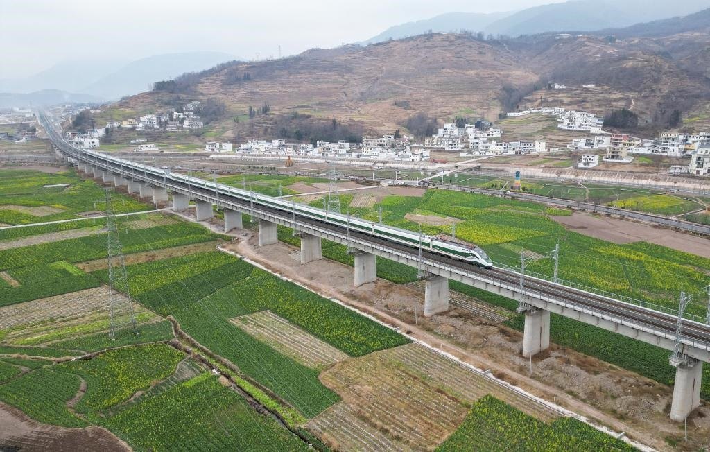 這是2月3日,一趟列車通過越西縣城郊(無人機照片)。新華社記者 王曦 攝