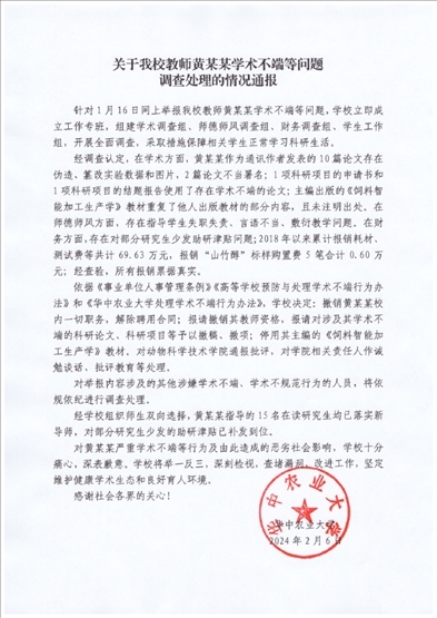 ·華中農(nóng)業(yè)大學(xué)通報教師黃某某學(xué)術(shù)不端等問題:撤職、解聘,其指導(dǎo)的15名研究生均已落實(shí)新導(dǎo)師。
