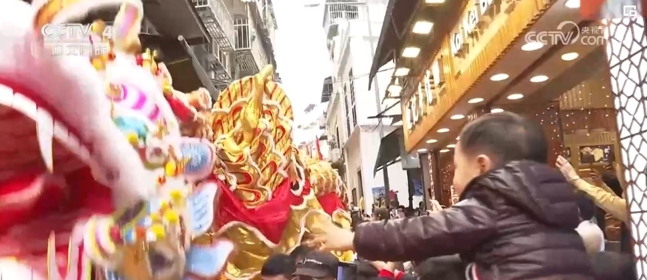 農歷春節(jié)大年初一,澳門特區(qū)政府旅游局舉辦“歡樂春節(jié)——2024年龍騰舞躍賀新春”社區(qū)巡演活動。238米長的大金龍和18頭醒獅,穿越澳門大街小巷和主要景區(qū),市民和游客紛紛伸手觸摸金龍和醒獅,迎春納福。