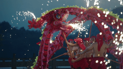 生龍活現(xiàn)(放煙花):登場(chǎng)的兩條龍,點(diǎn)燃提前放置的焰火筒,在龍珠的帶領(lǐng)下,形成“口中火”“脊上火”“腹中火”“導(dǎo)引火”的立體方陣,熱烈多彩。