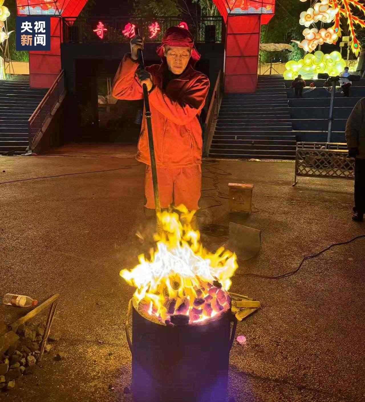 朱華偉站在火爐旁,舀起一勺冒泡的鐵水,大喝一聲,把鐵水拋向空中,快落地時(shí),徒弟用木板用力一擊,“啪啪!”一串巨響,1500℃的鐵水瞬間在空中炸開,綻放成美麗的煙花雨。