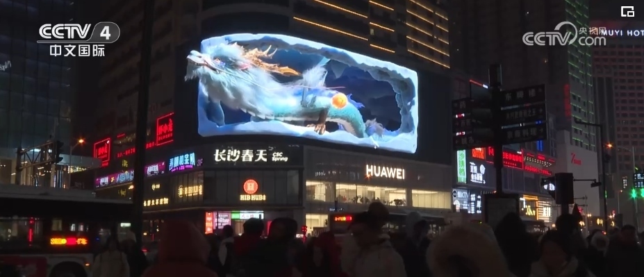 隨著夜幕降臨,在上海市南京西路這家商場(chǎng)戶外大屏,在裸眼3D技術(shù)的加持下,一條靈動(dòng)時(shí)尚的“光影巨龍”騰飛而出。同時(shí),上海南京西路商圈的多個(gè)地標(biāo)建筑,也開啟了春節(jié)燈光演繹。