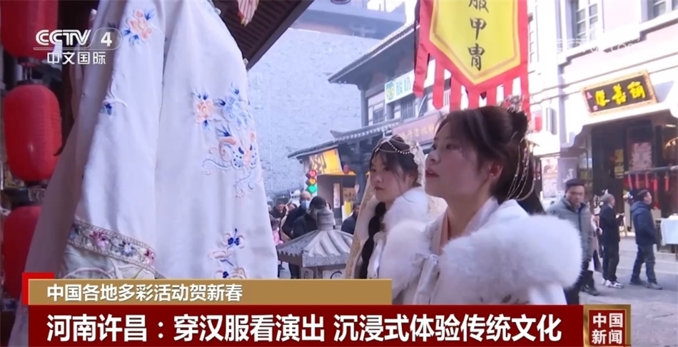 在河南許昌曹魏古城景區(qū),各種傳統(tǒng)游園項(xiàng)目讓人應(yīng)接不暇,不少游客穿上漢服,戴上鮮艷的簪花,穿梭于亭臺(tái)樓榭之間,與古城相映成趣。