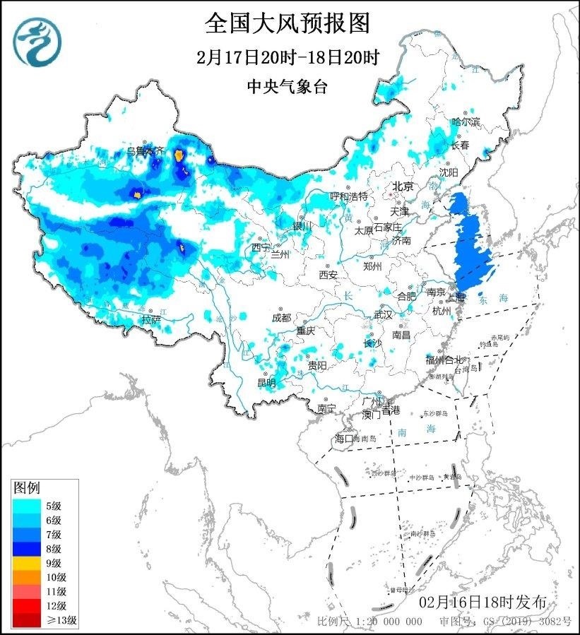 2月17日20時至18日20時,新疆北疆東部和南疆盆地、內(nèi)蒙古西部、青海西南部、西藏西部、甘肅西部等地將有5~7級、陣風(fēng)8~9級的大風(fēng),新疆山口地區(qū)風(fēng)力可達(dá)10級,陣風(fēng)12~13級;黃海大部海域、東海北部海域?qū)⒂?級、陣風(fēng)8~9級的大風(fēng)。