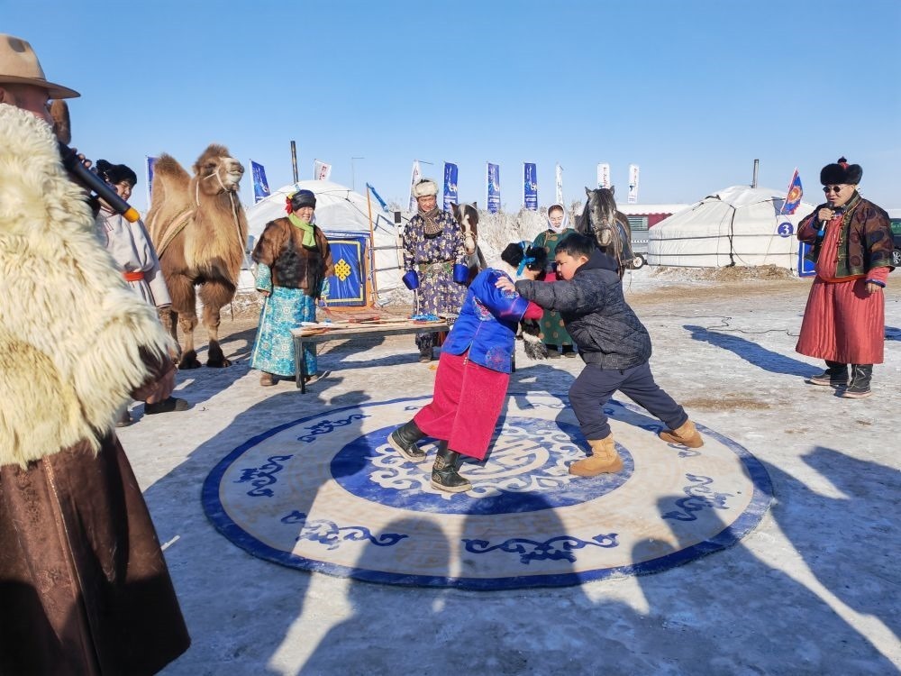為迎接“十四冬”,呼倫貝爾推出了豐富多彩的文化活動和產(chǎn)品。陳巴爾虎旗的牧民巴圖蘇和與合伙人在莫爾格勒河景區(qū)推出“天天冰雪那達(dá)慕”活動,設(shè)雪地搏克、騎馬射箭、“冰地嘎拉哈”、駱駝爬犁等項目,讓游客沉浸式體驗蒙古族文化與傳統(tǒng)運(yùn)動。首次嘗試雪地搏克的河北固安游客張瑞堂,與一位蒙古族少年友好競技,他的姐姐則用手機(jī)記錄下了這段珍貴的經(jīng)歷。