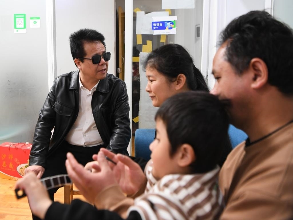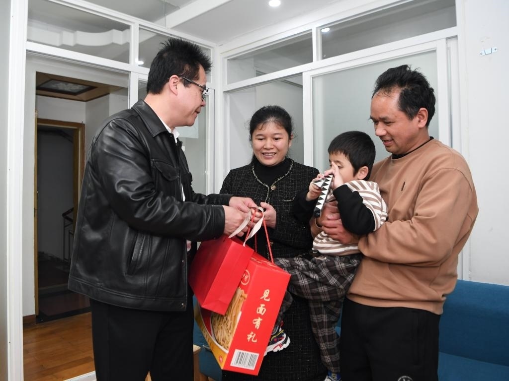 王永澄(左一)在福州市鼓樓區(qū)紅墻巷小區(qū)為盲人家庭送來(lái)新春慰問(wèn)(2月18日攝)。