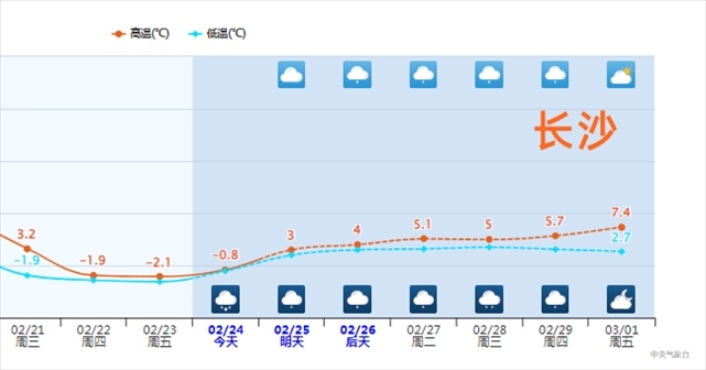 比如長沙,自2月21日14時以后,氣溫持續(xù)在0℃以下運行,已超過70個小時,2月下旬連續(xù)如此長的低溫,幾乎前所未見。2月的最后幾天,長沙最高氣溫將不超過6℃,今天甚至不到0℃,常年同期平均最高氣溫在10℃以上,比常年冷得多。
