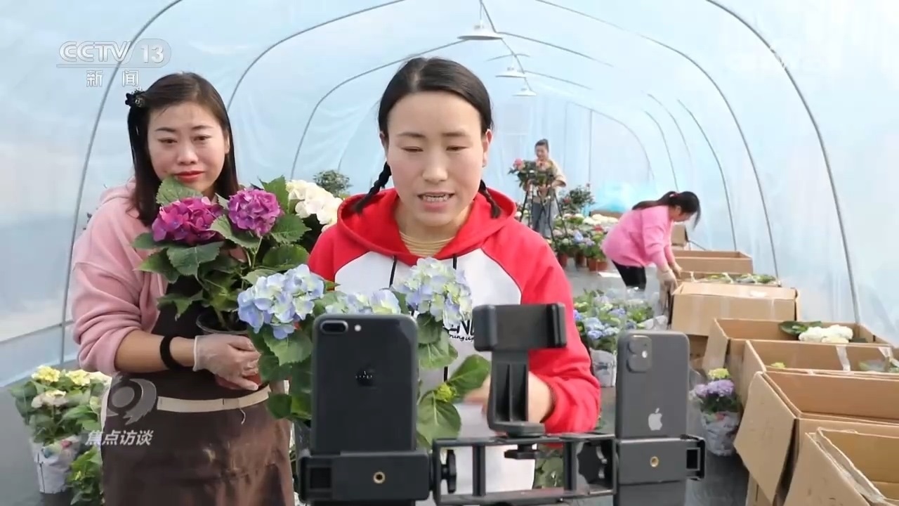 江蘇省宿遷市沭陽縣是全國聞名的“花木之鄉(xiāng)”,也是江蘇省面積最大的花木生產(chǎn)縣。近年來,沭陽進(jìn)一步完善“互聯(lián)網(wǎng)+三農(nóng)”模式,依托本地花木特色優(yōu)勢和電商先發(fā)優(yōu)勢,持續(xù)壯大花木電商,推動產(chǎn)業(yè)迭代升級。每天晚上,走進(jìn)沭陽縣新河鎮(zhèn)主播之家的盆景基地,都能看到一片熱鬧的場景。臺上一名拍賣師,臺下五十多名網(wǎng)絡(luò)主播同時直播,一邊與粉絲互動,一邊幫忙喊價。在沭陽的各個溫室大棚,也經(jīng)常能看到農(nóng)戶在帶貨直播,在這里,手機(jī)變身為“新農(nóng)具”、直播變成了“新農(nóng)活”。